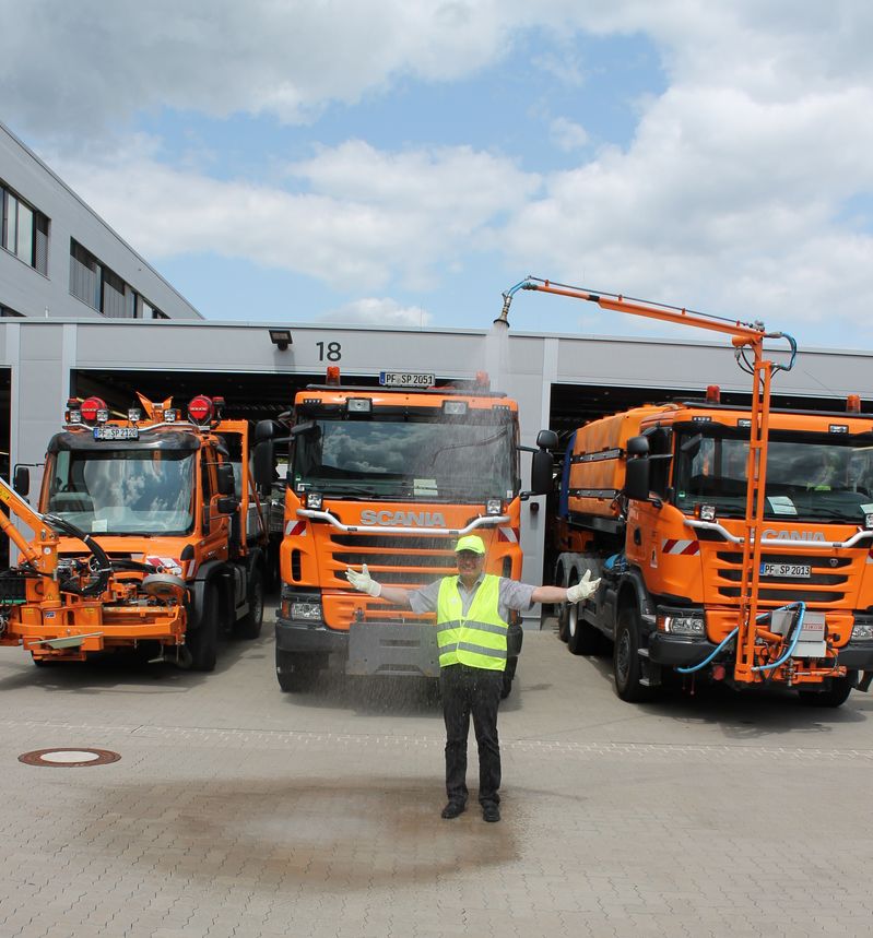 Vertrauen genießt Hartmann auch bei seinen Leuten, schließlich lautet sein Credo: „Die Kollegen müssen Spaß an der Maschine und ihrer Bedienung haben.“ In „jeden Beschaffungsprozess“ bindet der 44-Jährige das Team mit ein. Denn es mache letztlich keinen Sinn, nach dem Kauf einer Maschine beispielsweise über den falschen Fahrersitz zu diskutieren. Nahezu paradiesisch muten auf den Vertreter der schreibenden Zunft die Rahmenbedingungen in Pforzheim an: Um den Maschinen- und Fahrzeugbestand „aktuell und jung“ zu halten sowie um „Ausfälle speziell in der Winterzeit“ zu vermeiden, investiert die nicht gerade als arm geltende Stadt jährlich etwa 1,2 Millionen Euro. Und zwar in „Arbeitsmittel“ ganz nach Gusto von Hartmann und seinen Mannen: 23 Lkw – vom Scania-Abroller, über den Mercedes Atego, diverse MAN-Kipper bis hin zum Multicar –, 13 Schlepper (in erster Linie große Unimog), acht Sonder- sowie 65 Leasingfahrzeuge stehen für die täglichen Aufgaben zur Verfügung.