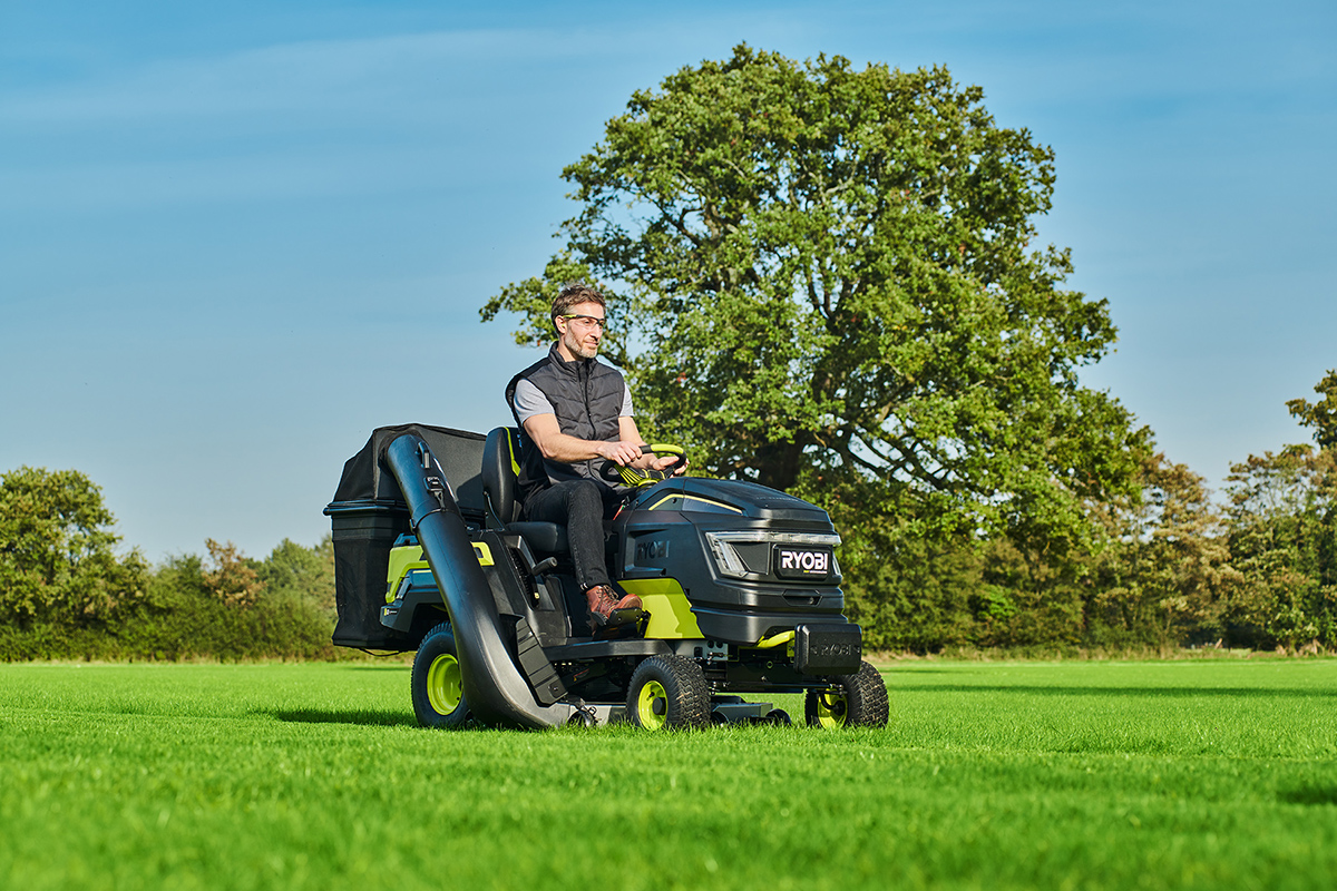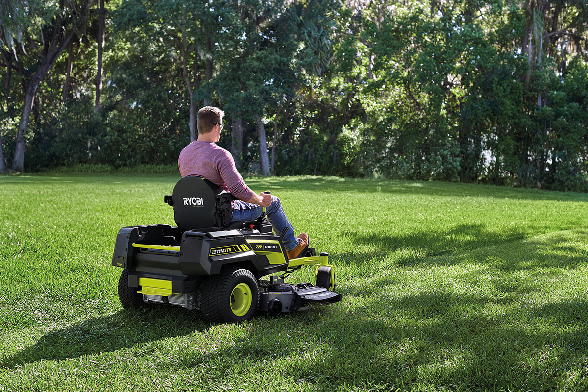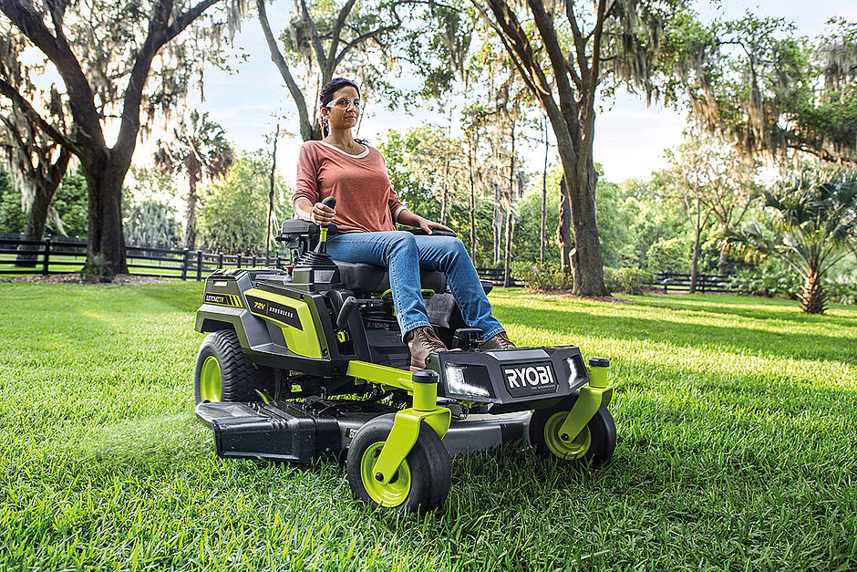 Mit zeitgemäßer, leistungsfähiger 72-V-Lithium-Ionen-Akkutechnologie löst Ryobi in der Geräteklasse der Aufsitzrasenmäher den Einsatz von Benzinmotoren ab. Gleich fünf verschiedene Modelle gehören zum Sortiment, davon drei Nullwendekreis-Mäher mit Joystick-Steuerung und zwei Rasentraktoren mit Lenkrad.