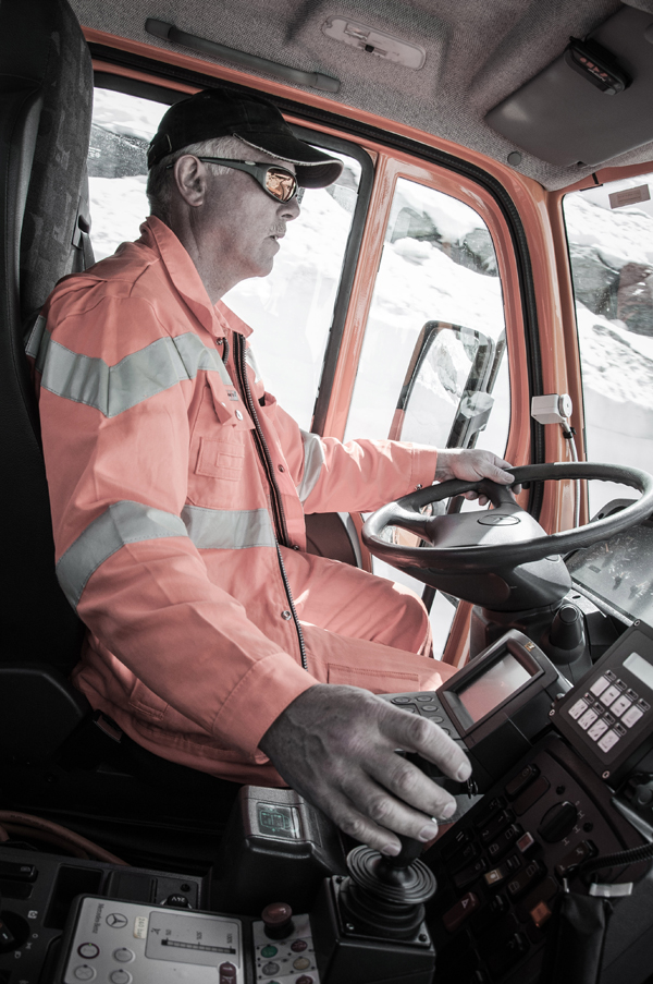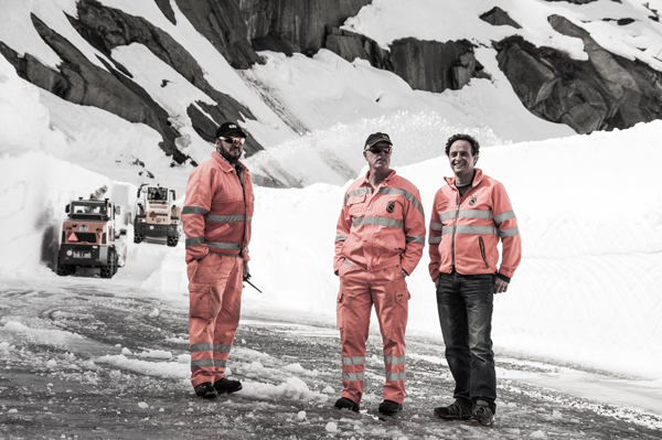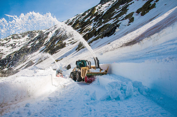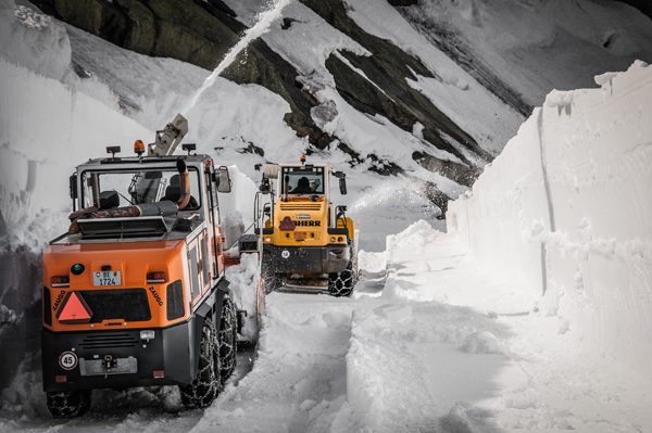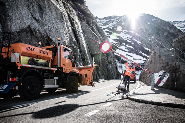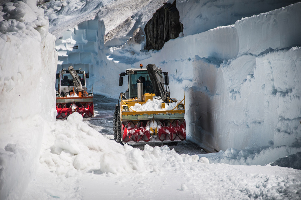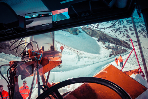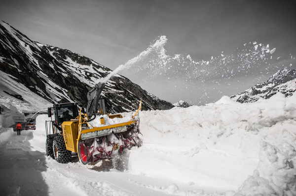 Es ist noch früh am Morgen, als sich die schweren Fahrzeuge in Bewegung setzen. Bei einer Steigung von 11% schrauben sie sich die Serpentinen nach oben in Richtung der Gipfel. Schwarzer Dieselqualm schießt in Intervallen aus ihren Auspuffrohren, während die Drehzahlen der Motoren von den Fahrern hochgepeitscht werden. Die beste Zeit für die Passräumung ist zwischen 5 Uhr Morgens und 11 Uhr Vormittags. Danach ist die Lawinengefahr zu hoch.