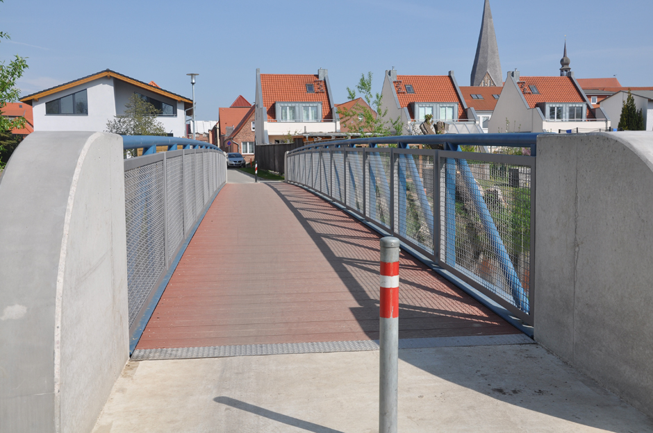 Die zu erneuernde 25 Meter lange und rund 2,8 Meter breite Brücke, somit also eine Fläche von rund 70 m², wurde mit den TRIMAX-Belagsbohlen 5 x 30 cm im Farbton rotbraun belegt. Mit Bohlen des gleichen Fabrikates wurde die Unterkonstruktion gebaut, jedoch mit den Profilabmessungen 5 x 10 cm und im Farbton grau. Mitarbeiter der Schmees & Lühn GmbH & Co. KG, mit Sitz im niedersächsischen Fresenburg, errichteten die ansehnliche Brücke.