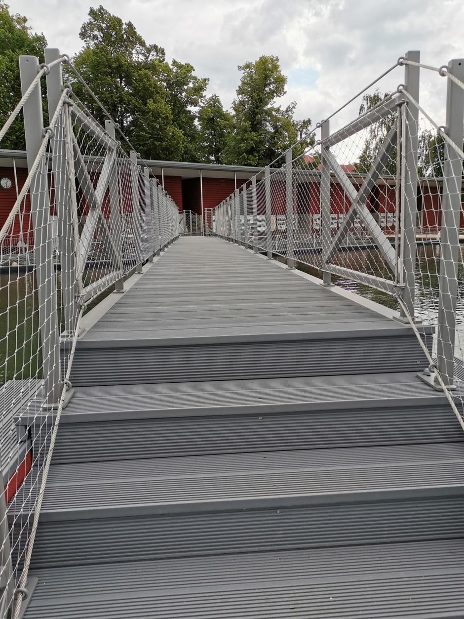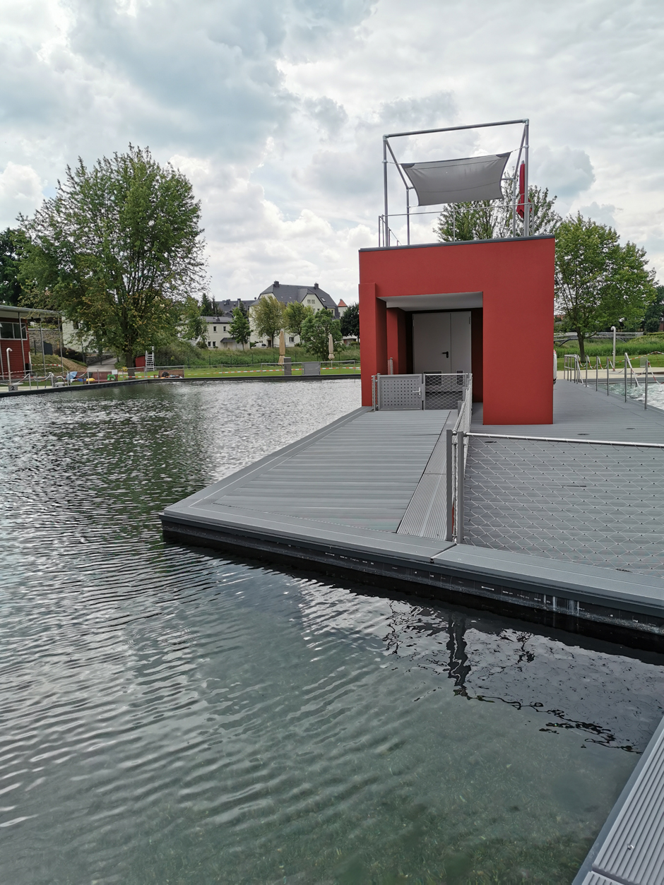 Rechtzeitig zur Saison sind die Badestege im Naturerlebnisbad Großenhain jüngst durch die Kratzer Metallbau GmbH aus Zittau fertiggestellt worden. Da der Bauherr auf Nachhaltigkeit sowie Wartungsfreiheit der zu verwendenden Materialien setzte, entschloss er sich für die bauaufsichtlichen Zugelassenen TRIMAX-Profile in den Maßen fünf mal 30 cm für den Belag, drei mal 30 cm für die seitlichen Verblendungen und fünf mal zehn cm für die Unterkonstruktion.