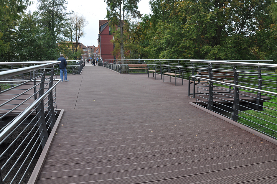 Nach den langjährigen, bereits gesammelten Erfahrungen der Stadt mit den im 19 km entfernten Bad Bodenteich hergestellten und bauaufsichtlich zugelassenen Trimax-Profilen stand für die Bauherrin fest, diese als Unterkonstruktion und Belag zu verwenden. Verbaut wurden somit drei cm dicke Bohlen in unterschiedlichen Breiten für die Unterkonstruktion und fünf cm dicke Riffelbohlen mit einer Breite von 30 cm für den Belag. Der Oberbau wurde komplett im Farbton dunkelbraun realisiert, während die Rohr- und Metallbau Busch GmbH aus Osterwald den Stahlbau und die Belagsarbeiten ausführte. Trimax-Profile werden aus recyceltem, sortenreinem Kunststoff von der Tepro Kunststoff-Recycling GmbH & Co. KG mit Sitz im niedersächsischen Bad Bodenteich hergestellt und können vollständig recycelt werden.
