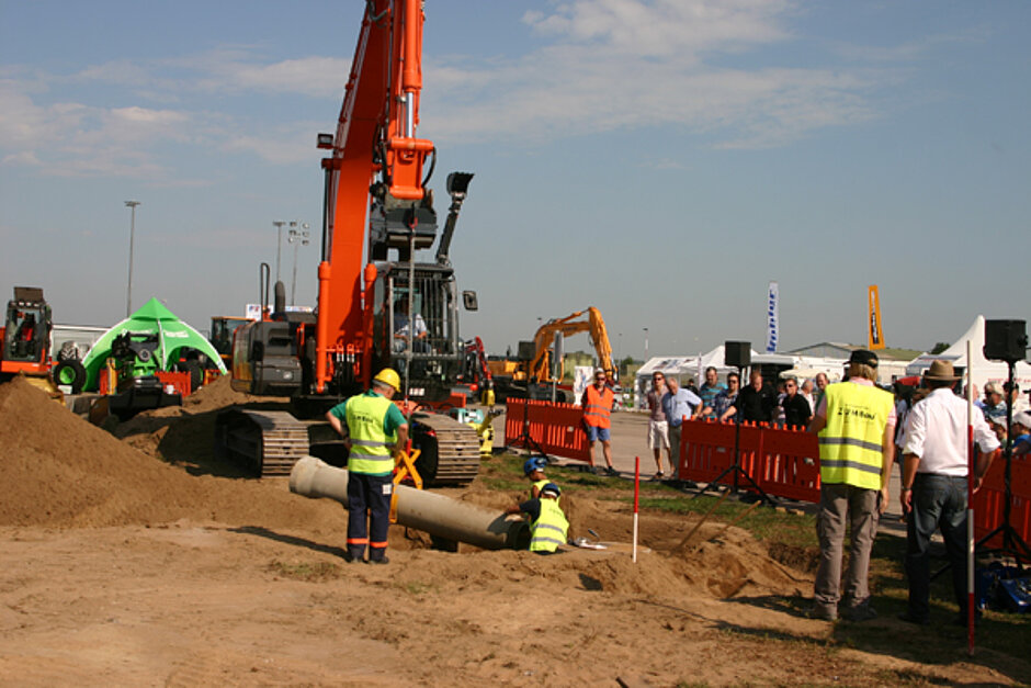 Auf der „Musterbaustelle“ präsentieren sich mehr als zehn Firmen, um verschiedene Bauprozesse im Straßen-, Kanal- und Rohrleitungsbau abzubilden. Durch die fachkundige Moderation wird dem Besucher der Baustellenablauf und Mehrwert der eingesetzten Gerätschaften erläutert.