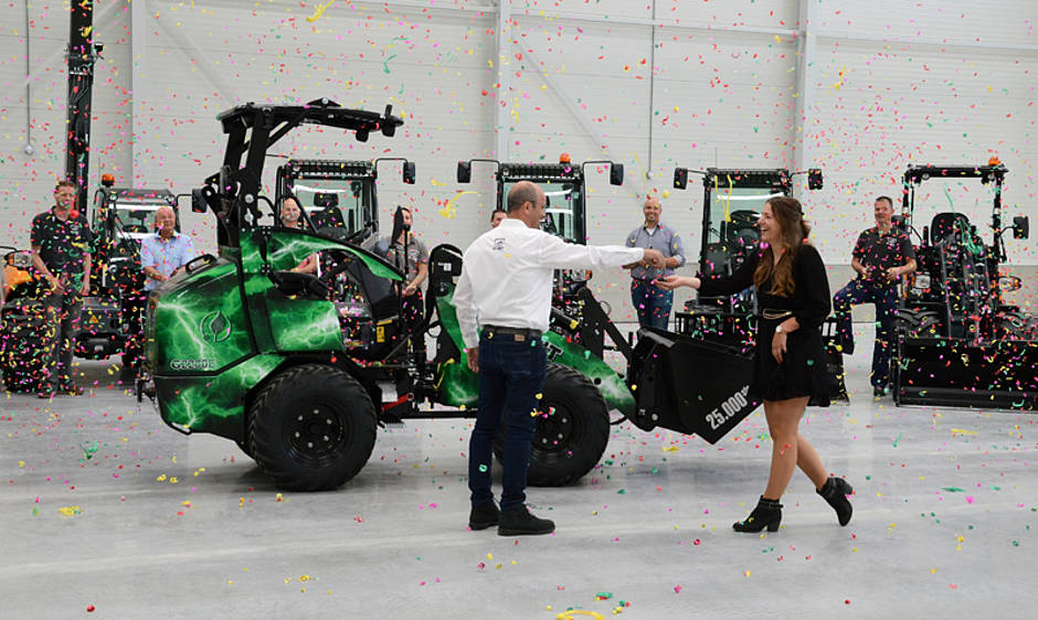 Die 25.000-ste Maschine ist ein elektrischer G2200E X-TRA, der letzte Woche in Oisterwijk produziert wurde. Es ist nicht überraschend, dass es sich dabei um eine elektrisch angetriebene Maschine handelt, da derzeit die Nachfrage für elektrische Radlader stetig ansteigt. Der G2200E X-TRA ist eine Spezialausführung mit individueller Farbgebung und wurde an E-Den Hartog übergeben, ein neues Unternehmen von GIANT-Händler Den Hartog Bouwmaterieel, welches sich überwiegend auf den Handel und die Wartung von elektrischen Maschinen spezialisiert hat.