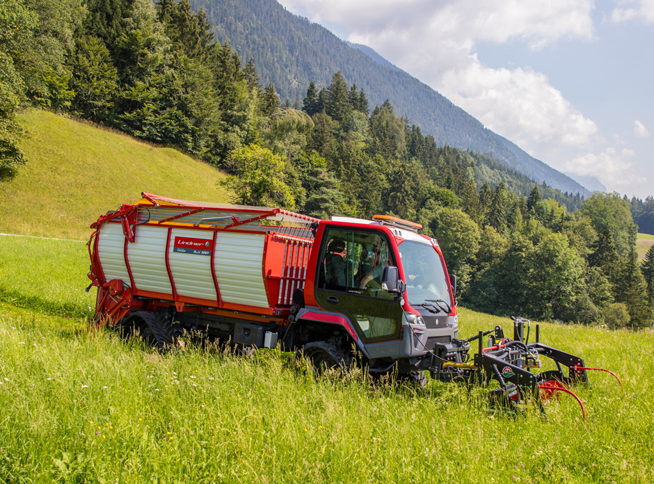 Als zweiter Bestandteil der Maschinenkombination dient der Aufbau-Ladewagen mit Schwingen-System, den Lindner mit der Firma Gruber entwickelt hat. Im Gegensatz zu herkömmlichen Saugtechniken wird das Erntegut ohne Verwirbelungen in den sehr geländetauglichen Ladewagen gelegt – auch das schont Bienen, Schmetterlinge und weitere Insekten.