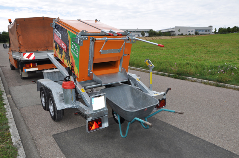 Ein weiteres großes Plus an der neuen Konstruktion sind Sicherheitsarretierungen an allen Öffnungsdeckeln und Gasdruckfedern zur Unterstützung beim Anheben der Fülldeckel. Vor allem aber kann die Asphaltbox vom Personal vollständig im Schutzbereich hinter dem Fahrzeug bedient werden. Somit bietet dieser gebrauchsmustergeschützte Thermocontainer mehr Sicherheit auf Straßenbaustellen.