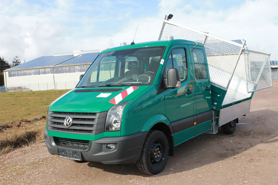 Mit einem Ladevolumen von rund acht Kubikmetern zeigt Volkswagen Nutzfahrzeuge einen Crafter Doppelkabine mit Drei-Seiten-Kippaufbau. Das von der Firma Schoon umgebaute Fahrzeug verfügt über einen stabilen und feuerverzinkten Rahmen. Der Kipper wird über ein leistungsstarkes, elektrohydraulisches Aggregat in einem hart verchromten Kippzylinder angetrieben. Die Ladungssicherung ist TÜV-geprüft.