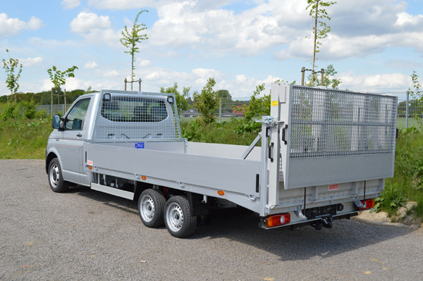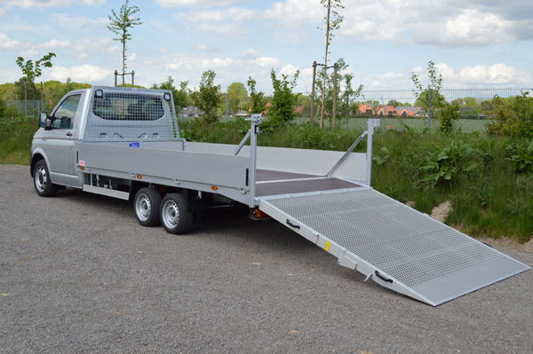 Schwere Lasten kann der Volkswagen Transporter der sechsten Generation mit dem 13-Zoll Chassis von AL-KO und einem Maschinentransporter-Aufbau der Heinz Schutz GmbH mühelos transportieren. Dank der zweifach klappbaren Auffahrrampe und der AL-KO Luftfederung beträgt die Ladehöhe lediglich 550 Millimeter. Damit lassen sich selbstfahrende Arbeitsmaschinen auch mit flachem Überfahrwinkel unkompliziert verladen. Das Fahrzeug hat ein zulässiges Gesamtgewicht von 4,6 Tonnen. Die Nutzlast beträgt bis zu 2.500 Kilogramm. Das serienmäßige Elektronische Stabilitäts-Programm (ESP) des T6 sorgt auch bei schwerer Ladung für hervorragende Fahreigenschaften, bestmöglichen Federungskomfort und optimale Bremsleistung.