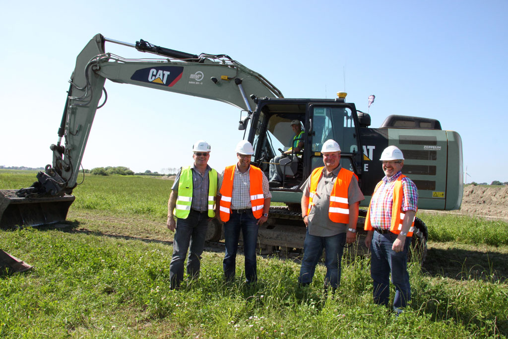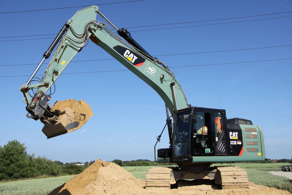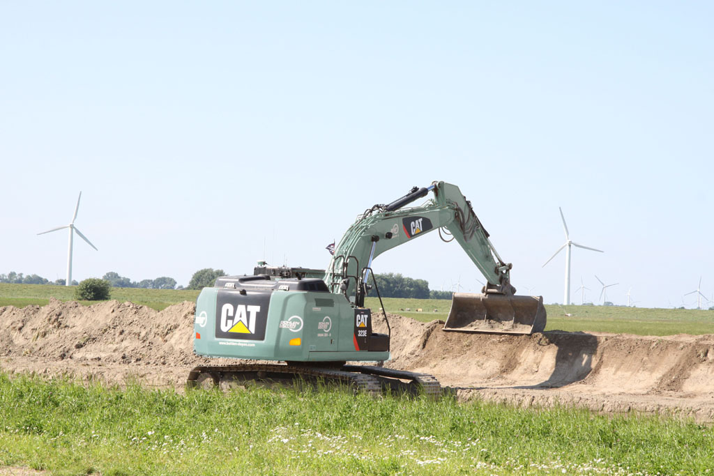 Im Einsatz sind sechs Kolonnen mit Baggern der 25- oder 30-Tonnen-Klasse. Ihnen sind weitere Baumaschinen, darunter Radlader wie ein Cat 908H und 924H zugeordnet. Fünf Cat Kettenbagger 323EL, die von Reinhold Bosl, Zeppelin Konzernkundenleiter, und Oliver Stumpf, leitender Verkaufsrepräsentant von der Zeppelin Niederlassung Westerstede, zusammen mit den Radladern geliefert wurden, verrichten entlang der Bautrasse Aushubarbeiten für den fünf Meter breiten Kabelgraben. Ausgestattet sind die neuen Bagger mit Löffeln, die ein Trapezprofil in Form des Grabens aufweisen, um schnell beim Aushub Meter zu machen.