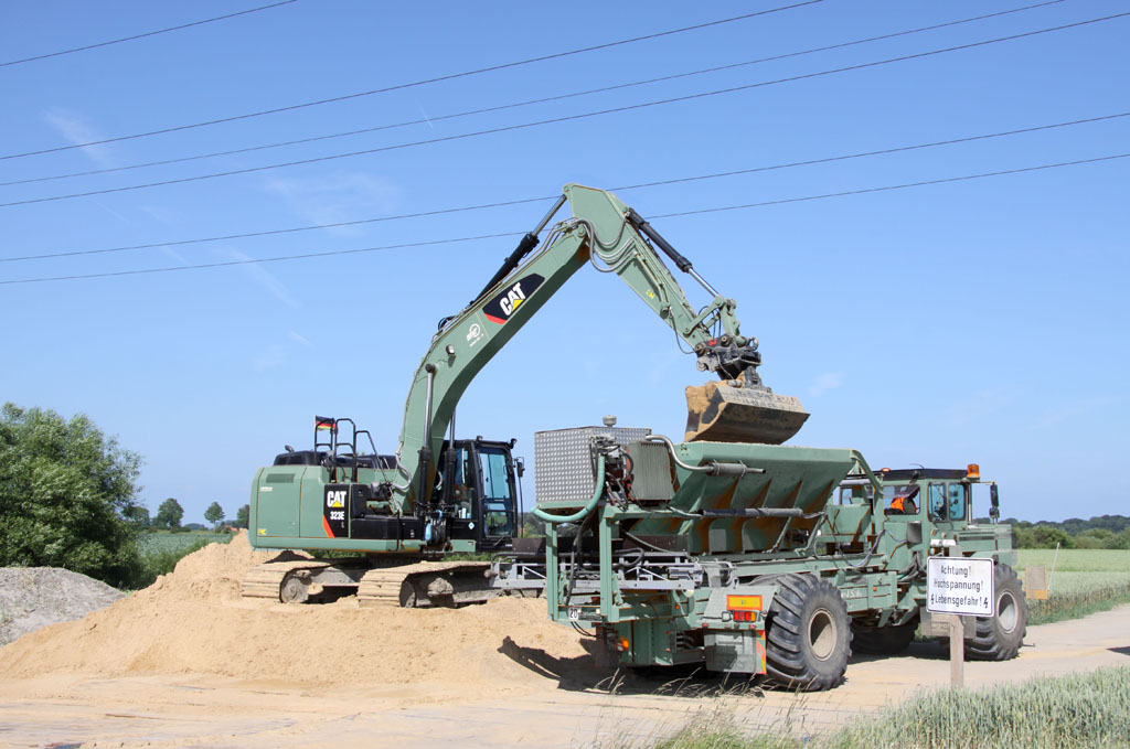 Die Tiefe des Aushubs, der in 59 Sektionen zu rund 830 Meter unterteilt wurde, variiert. Die geforderte Mindestabdeckung liegt bei 1,20 Meter – sie kann aber bis zu 1,90 Meter betragen. Auf einer Trommel, die per Lkw mit Tiefbett geliefert wird, passt ein 840 Meter langes Kabel mit einem Durchmesser von 125 Millimetern. Aufgabe von Prysmian ist es, die Kabel miteinander zu verbinden. Das Kabel ruht auf einem Bett aus Sand mit einer Sohlenstärke von zehn Zentimetern. Das Kabel wird mit einer 30 Zentimeter dicken Sandschicht abgedeckt. Der Sand stammt aus verschiedenen Sandgruben der Region und wird mit Cat Kettenbaggern 323EL auf Dumper oder Terra Gator verladen, mit deren Hilfe dann die vorgegebene Sohlenstärke oder Abdeckschicht des Kabels hergestellt werden kann. „Was die Sandlieferung betrifft, arbeiten wir vor Ort mit Lohnunternehmen aus der Umgebung zusammen. Es wird gerne gesehen, wenn wir nicht nur unsere eigenen Arbeitskräfte und Maschinen mitbringen“, meint Hollwedel.