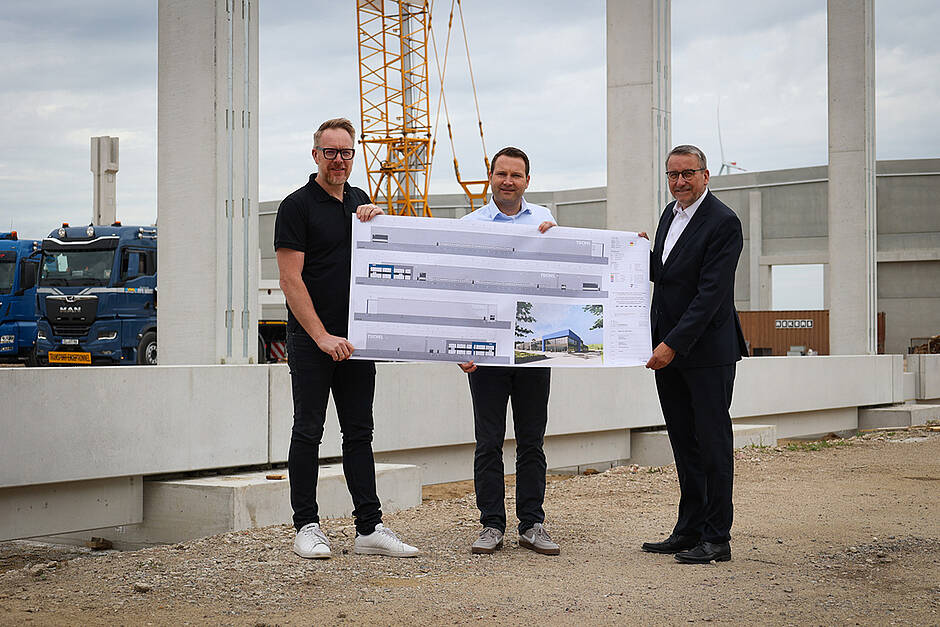 Das hochmoderne Gebäude entsteht auf einem Grundstück von knapp 26.000 m2 im verkehrsgünstig gelegenen Gewerbegebiet Holsterfeld in Salzbergen. Es umfasst eine Produktionsfläche von circa 12.000 m2 sowie 400 m2 Büroräumlichkeiten. Rund 80 Mitarbeiter werden hier zukünftig tätig sein. Gemeinsam mit dem Bürgermeister der Gemeinde Salzbergen, Andreas Kaiser und dem Architekten Michael Boyer von bb architekten boyer & bröckerhoff GmbH überzeugte sich Dennis Schürmann vom Fortschritt des Großprojektes.