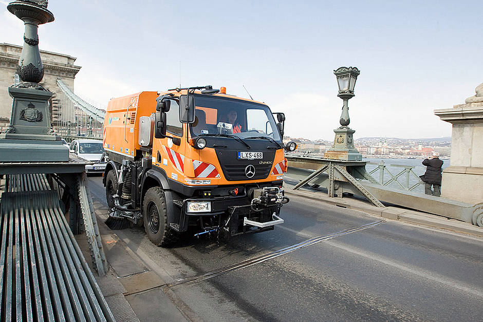 Wörth/Budapest - In der ungarischen Hauptstadt Budapest gehören sie nun schon zum alltäglichen Anblick: 21 Unimog U 20 von Mercedes-Benz arbeiten seit Oktober 2011 im Stadtteil Buda, in den Fußgängerzonen der Innenstadt und auf den Fußgängerwegen entlang der Donau. Die Qualitäten des Unimog U 20 hatten die Beschaffer des städtischen Reinigungsunternehmens EKF Zrt. überzeugt. Dabei spielte auch der Mehrfachnutzen des Unimog eine zentrale Rolle bei der Beschaffung: In den Winterwochen sind die Budapester Unimog mit Streuautomaten der Firma Gmeiner sowie Schneepflügen von Kahlbacher ausgerüstet, ab dem Frühjahr mit Kehrmaschinen des Typs TK 20 von Trilety. So ist jeder Unimog über das ganze Jahr hinweg permanent einsetzbar - eine hochwertige Kombination von Geräteträger und Geräten. Sie wird dringend benötigt in der weltberühmten 1,7 Millionen Einwohner zählenden Metropole, denn diese stellt sehr spezielle Anforderungen an den Straßendienst: Breite Straßen und Fußgängerwege am Donauufer, enge Altstadtgassen, stark belebte Fußgängerzonen und steile, kurvenreiche Passagen auf die Budaer Berge reihen sich im täglichen Einsatz aneinander, die Unimog verrichten ihre Arbeit im stets dichten und hektischen Individualverkehr. Kalte Winter und heiße Sommer gehören hier regelmäßig zum Jahresablauf. Auf all das zeigen sich die Unimog U 20 und ihre Geräte umfassend vorbereitet. So ist der drei Kubikmeter fassende Schmutzbehälter des Kehraggregats auf dem Unimog U 20 komplett in langlebigem Edelstahl ausgeführt und verfügt über eine eigene, auf der Frontzapfwelle montierte Hydraulikanlage zur geräteinternen Kraftübertragung, woraus eine hohe Saugkraft resultiert.