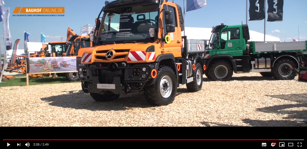 Erstmals ist der Unimog jetzt auch mit Abbiegekamerasystem und Ultraschall-Seitensensorsystem zum Schutz von schwächeren Verkehrsteilnehmern wie zum Beispiel Fahrradfahrern verfügbar. Ein entsprechend ausgestatteter U 218 ist auf der Messe Demopark ausgestellt.