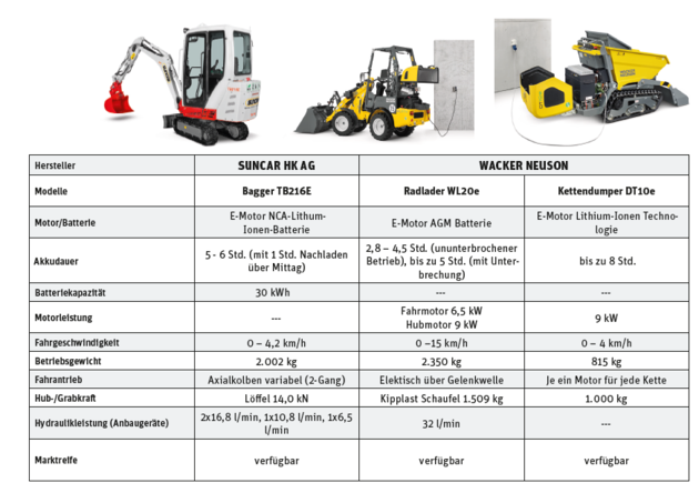 Neben den reinen Elektrobaumaschinen befinden sich auch einige Hybriden aus Diesel- und Elektromaschine auf dem Markt. Sowie der Minibagger 300.9D VPS von Caterpillar, der mit einem zusätzlichen Stromaggregat, an das er vor Ort angeschlossen wird, emissionsfrei arbeiten kann. Genauso verhält es sich mit dem 803 dual Power Kompaktbagger von Wacker Neuson. Takeuchi hingegen verzichtet auf ein zusätzliches Stromaggregat. Bei den vier Modellen TB 210 RH, TB 216 SH, TB 228 H und TB 235 H kann im Handumdrehen vom Diesel- auf den Elektroantrieb umgeschaltet werden.