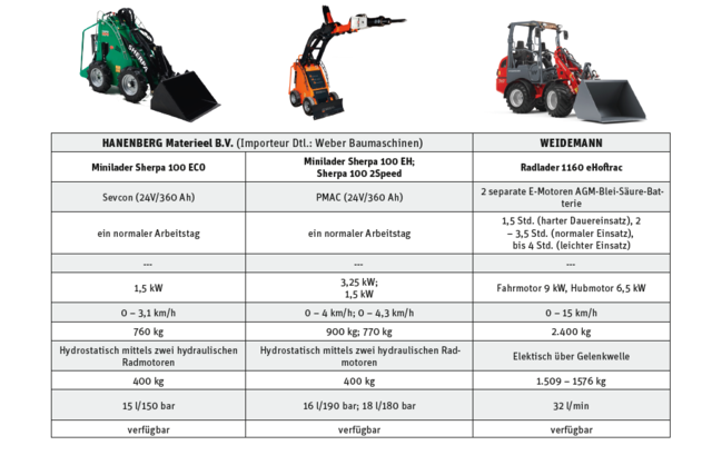 Bislang ist die Zahl an reinen E-Ladern und -baggern noch recht überschaubar, wie unsere Marktübersicht (ohne Gewähr auf Vollständigkeit) zeigt. Zum Einsatz kommen so gut wie immer die fortschrittlichen Lithium-Ionen-Batterien, bei den auch Zwischenladungen kein Problem mehr darstellen. Laut Angabe der meisten Hersteller schaffen die Akkus der Maschinen einen ganzen Arbeitstag. Wobei hier stets unterschieden wird, ob die Maschine für harte Dauereinsätze oder normale Tätigkeiten hergenommen wird. Eine große Rolle spielt auch die Jahreszeit. Bei kälteren Temperaturen hält der Akku weniger lang durch, als bei warmen – schon allein deshalb, weil dann auch die Heizung einen Teil der Akkuleistung verbraucht. Bei den Baggern und Ladern schwankt die Akkudauer somit in der Regel zwischen 1,5 und acht Stunden. Sind die Maschinen mit einem On-Board-Ladegerät ausgestattet, können sie an einer normalen 230-V-Steckdose über Nacht wieder aufgeladen werden. Oder man stöpselt die E-Baumaschine während Pausen einfach für eine kurze Zeit an. Besitzt die Maschine zudem ein Schnellladegerät, ist der Akku oftmals innerhalb einer Stunde schon wieder vollständig aufgeladen. Zwar sind es vor allem die kleinen Modelle, die derzeit als E-Varianten auf den Markt kommen. Doch es gibt auch eine Handvoll Hersteller, die den Elektroantrieb bereits bei größeren Maschinen einsetzen, wie beispielsweise Mecalac bei ihrem e12 Bagger oder auch die Suncar HK AG bei ihren Modellen TB260E und TB1140E.