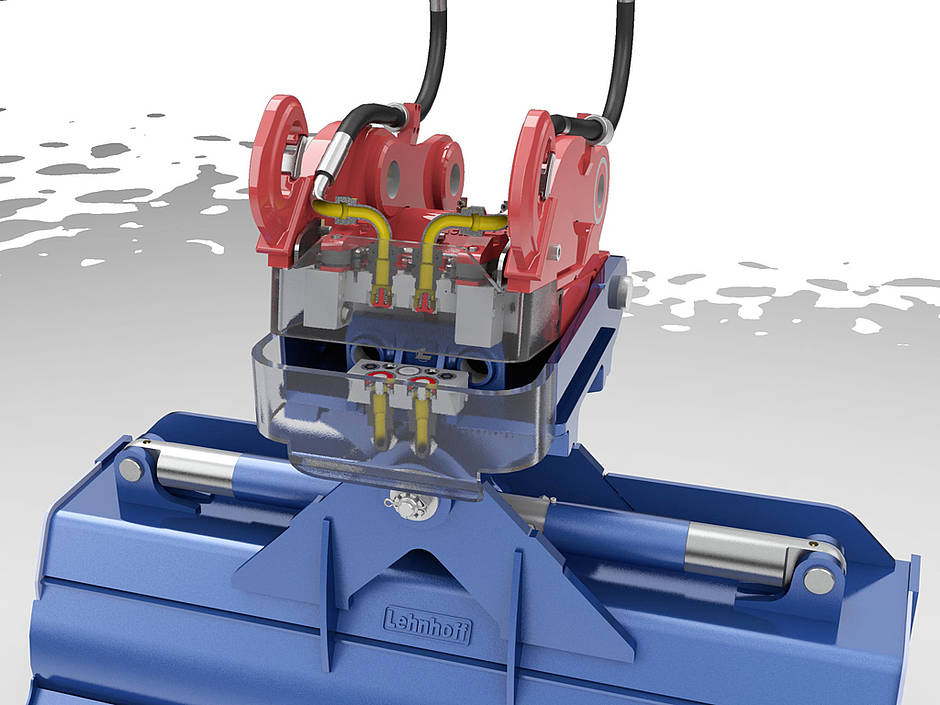Fünf integrierte Ventile öffnen über einen extrem kurzen Hub von nur 3,5 bis 5 Millimeter. Durch dieses „Herz” fließt innerhalb kürzester Zeit die maximale Ölmenge. Mit der Option der Werkzeugerkennung stellt sich der vom Anbaugerät benötigte Volumenstrom automatisch ein. Sämtliche hydraulischen Kreise der Anbaugeräte sind durch dieses High-Tech-System immer sicher und leckagefrei mit der Arbeitshydraulik des Baggers verbunden. Auch dann, wenn das Variolock-System zusätzlich mit einer Schwenk-, Dreh- oder Schwenk-Dreheinrichtung kombiniert wird.