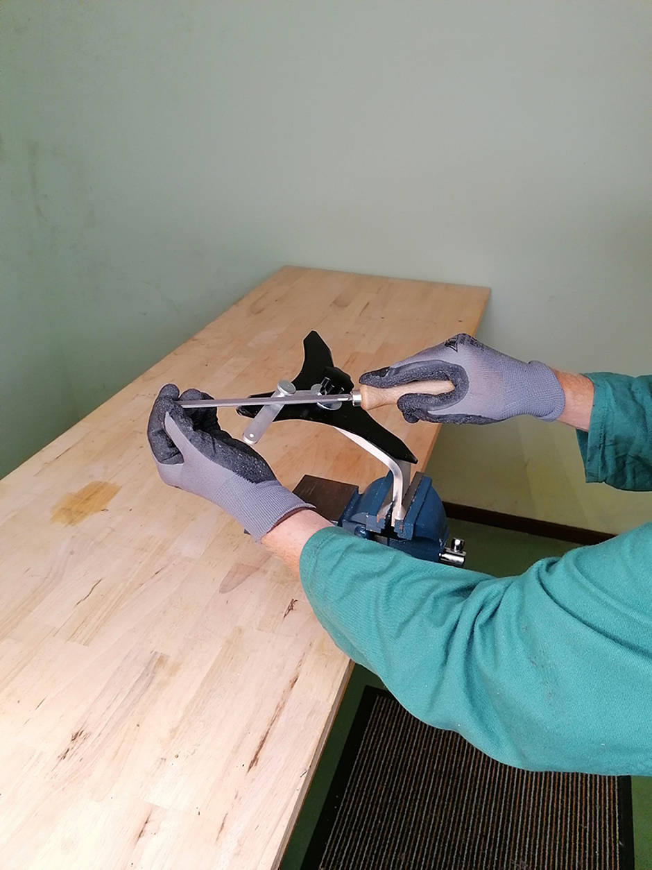 Das gleichmäßige Schärfen der Schneidkanten wird durch die Schneidkanten-Schablone erleichtert. Die eingestellte Länge und Lage der ersten geschliffenen Schneidkante wird schnell und präzise auf alle anderen Schneidkanten übertragen. Die neue Schärf-Hilfe für Dickichtmesser und Grasschneideblätter mit Schneidkanten-Schablone hilft die Sensenblätter präzise und einfach zu schärfen. Sie wurde in der Motorsägen-Schule SuperScharfeKette.de entwickelt und ist über den Online-Shop www.vert-i-file.de erhältlich.