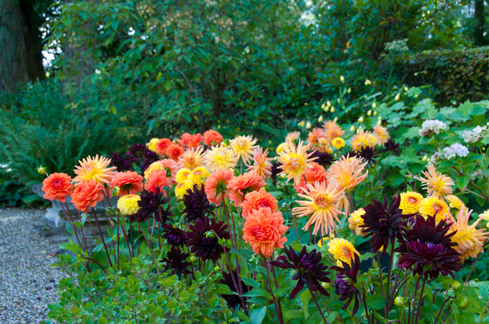 Eine Mischung aus Schmuckdahlien und Kaktusdahlien in warmen Farben. Bildet im Spätsommer ein farbenfrohes Patchwork in jeder Grünfläche!