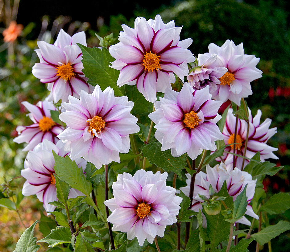 Dekorative Zwergdahlien sind Pflanzen mittlerer Größe und müssen deshalb nicht gestützt werden. Wenn Sie bis zu 4 Pflanzen pro m2 pflanzen, können Sie Beete nur mit Dahlien gestalten, die endlos lange blühen... „Edge of joy“ ist eine charmante Zwergdahlie, die bestens mit einjährigen Pflanzen kombiniert werden kann.