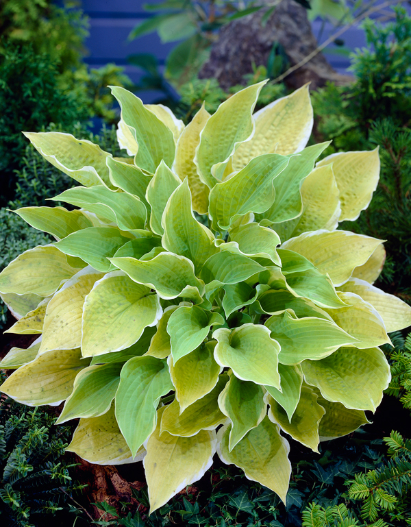 Robuste, herzförmige, leicht unebene gelbe Blätter mit einem weißen Rand. Die Blüten sind helllila.