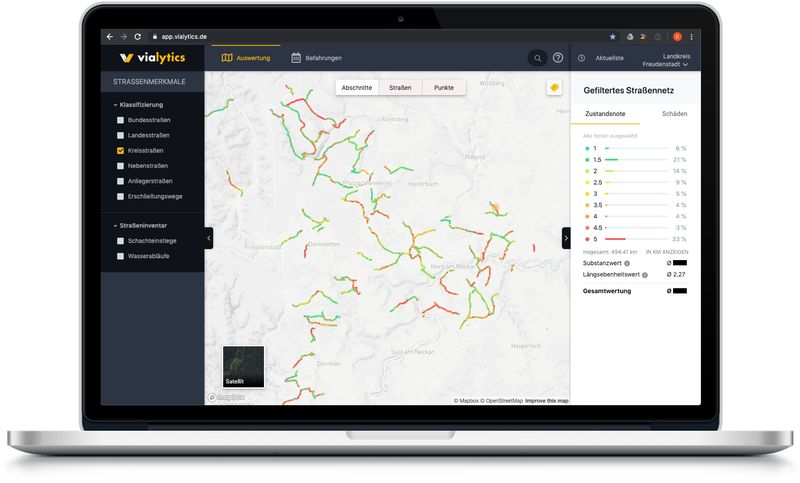 Hier werden die Daten auf Straßenschäden hin mit Hilfe von Algorithmen und neuronalen Netzen automatisch „untersucht“. Die künstliche Intelligenz erkennt die verschiedenen Schäden dabei selbstständig und bewertet und kategorisiert diese in die jeweiligen Schadensklassen. Binnen eines Monats werden die Ergebnisse den Kommunen zu Verfügung gestellt und umfassen sowohl das Bildmaterial als auch die GPS-Daten. Aufbereitet in einem intuitiv gestalteten und webbasierten Geoinformationssystem können sich die Kommunen nicht nur den Straßenzustand abbilden lassen, sondern anhand von Filter- und Analysemöglichkeiten auch aktiv an der weiteren Planung der Sanierung mitwirken.