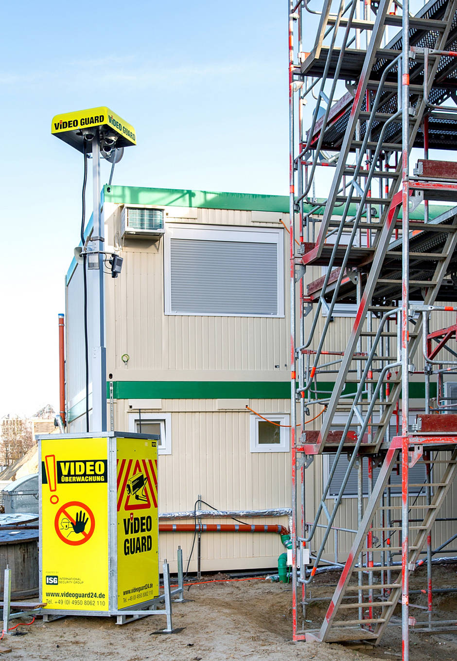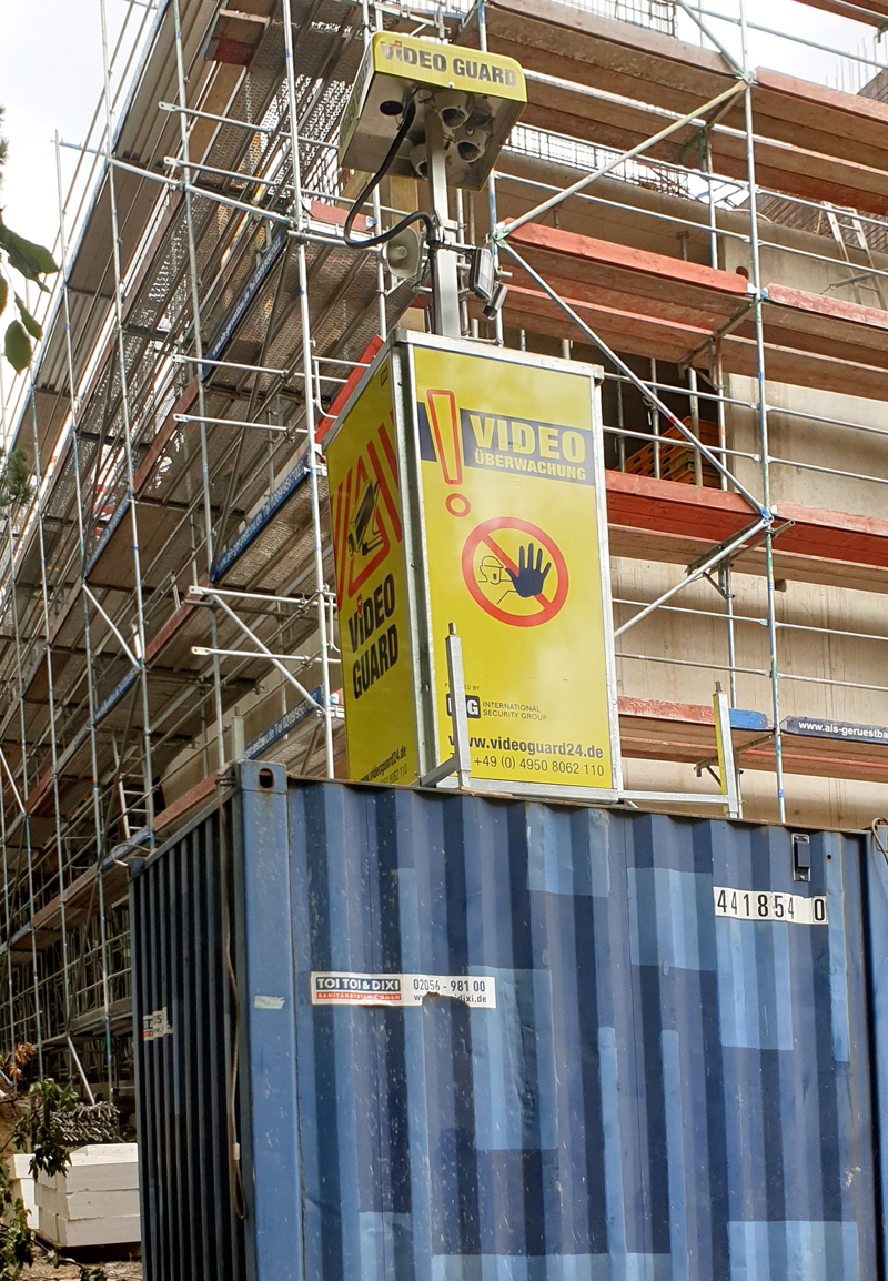 Systeme wie Video Guard Professional überzeugen durch eine baustellentaugliche Hardware, eine intelligente Software und eine angeschlossene Alarmzentrale. So ist der Tower mit den Kameras und einem integrierten Lautsprecher äußerst robust. Es gibt zudem eine solarbetriebene Variante, die unabhängig vom örtlichen Stromnetz funktioniert. Die Kameras erfassen das Gelände auch in den dunklen Abend- und Nachtstunden zuverlässig. Die Software meldet das Eindringen Unbefugter sofort an die angeschlossene Alarmzentrale. Hier arbeiten erfahrene Mitarbeiter, welche das Bildmaterial und die Situation bewerten und über die Lautsprecher am Tower zunächst verbal in das Geschehen eingreifen. Sollte dies nicht ausreichen, wird die Polizei hinzugezogen. Die direkte Ansprache führt jedoch in den meisten Fällen bereits zum Rückzug der potentiellen Täter – der Baucontainer bleibt geschlossen, Material und Werkzeug an Ort und Stelle. Der Arbeitsbeginn am nächsten Morgen erfolgt damit ohne böse Überraschungen.
