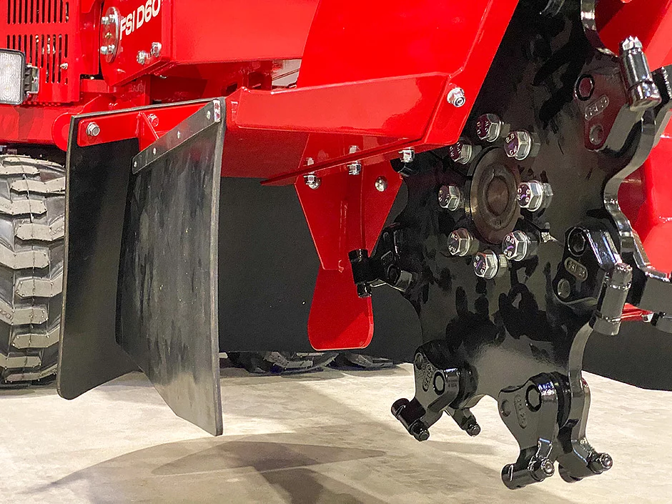 Durch die Schwenkbewegung des Drehkranzes der Maschine wird das Leitblech automatisch mitgeführt, schweres Material wird dank der ergonomischen Materialführung nach vorne ausgeworfen. Insbesondere bei Fräsarbeiten im Untergrund erweist sich das System als äußerst wirkungsvoll, um mit weniger Kraftaufwand eine höhere Fräsleistung zu erzielen. Darüber hinaus verringert sich der Verschleiß, da die Triplex-Werkzeuge (dreifach drehbar) der FSI-Fräsen weniger Kontakt mit abrasivem Fremdmaterial haben.