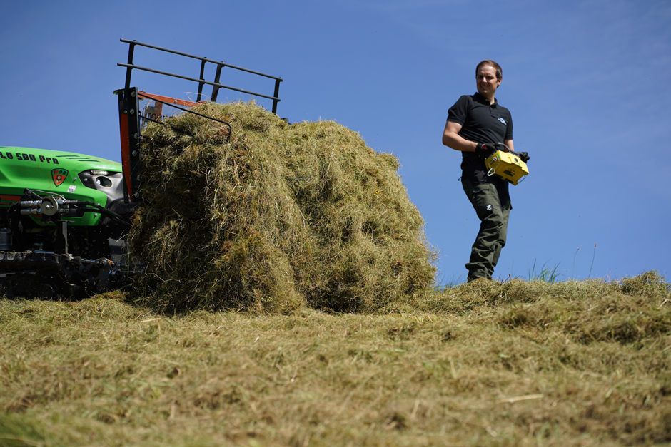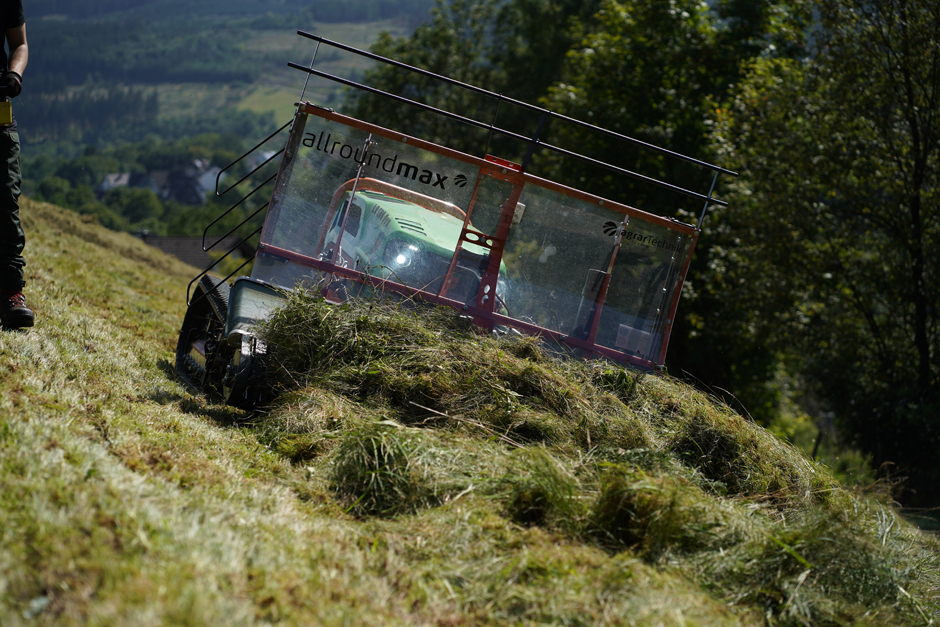 Im zweiten Arbeitsschritt muss das gemähte Gras dann von den Flächen abgeräumt werden. Verbreitete Technik wie Kreiselschwader oder Bandrechen stoßen in dem oft schwer zugänglichen Gelände an ihre Grenzen. Auch die großen Massen an Mähgut, die ja häufig über mehrere Arbeitsbreiten umgewälzt werden müssen, überfordern diese Technik. VOGT hat hier mit dem Pick-Up-Schwader ein spezielles Anbaugerät für die MDB-Raupen entwickelt, welches in diesem Extremgelände optimale Möglichkeiten zur sauberen und effektiven Bergung des Mähgutes eröffnet.