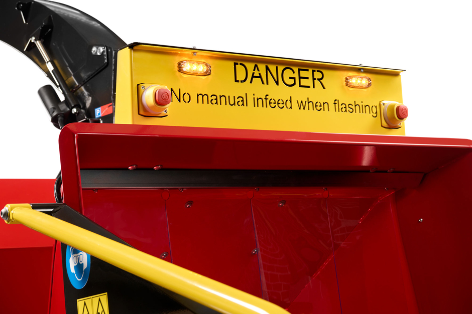 Wird FAST FEEDING aktiviert, kann die komplette Einzugs-Steuerung der Walzen (vorwärts, rückwärts, AUTO-REVERSE) und die TP STARTER Hackscheiben-Kupplung über den DANFOSS-Funk bedient werden. Nach Aktivierung werden alle Bedientasten am Hacker und der Sicherheitsbügel für die manuelle Beschickung deaktiviert, damit das Gerät nur noch über die Funkbedienung gesteuert werden kann. Ideal für ein komfortables Arbeiten aus der Kran- oder Baggerkabine mit hohem Durchsatz, ohne umständliches Absteigen. Zusätzliche Sicherheitsleuchten warnen unbefugte Personen vor dem Betreten des direkten Arbeitsumfelds während der maschinellen Material-Zuführung.