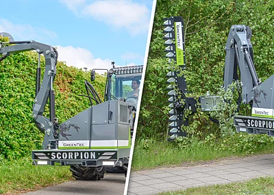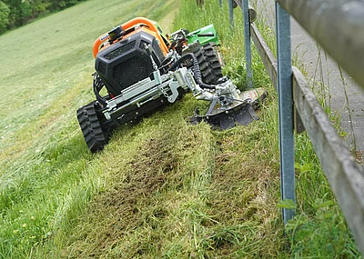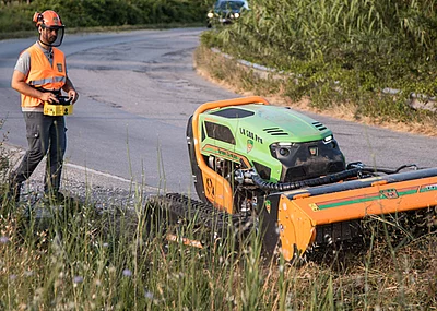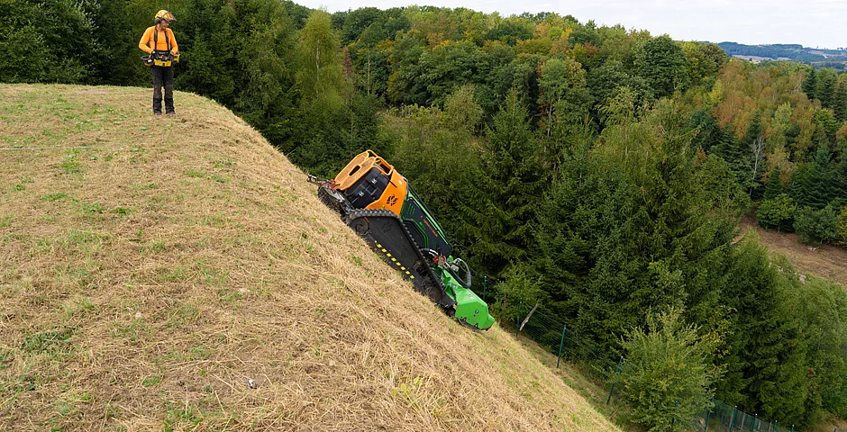 Beide Maschinen sind über die Funksteuerung durch einen einzigen Bediener gleichzeitig steuerbar. Laut Löher ist diese Arbeitsvariante mit Raupen bis zu zwanzig Mal effektiver gegenüber der konventionellen Handarbeit mit dem Freischneider. So können selbst schwierigste Flächen zielführend, sicher und bodenschonend bearbeitet werden.