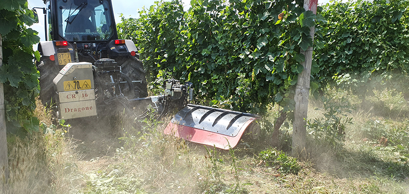 DRAGONE bietet verschiedene Modelle der CR-Serie an, wobei die Maschine standardmäßig mit einer Trommelbreite von 650 mm am Traktor-Dreipunkt angebaut wird und rechts heraus schwenkt. Da das Modell CR DOUBLE mit zwei Mähtrommeln ausgestattet ist, kann es beidseitig entlang der Fahrgasse arbeiten. Alternativ könne der Fadenmäher auch an einem Schlegelmulcher im Heck angebaut werden. In Kombination mit einem Mulcher für die Fahrgasse können zwei Pflegemaßnahmen in einem Arbeitsschritt erledigt werden.