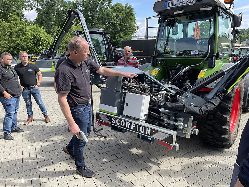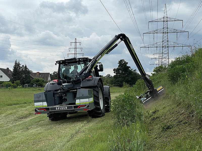 Seit 2019 bietet der dänische Hersteller Greentec auch eigene Ausleger an. Beispielsweise wurden die neuen Spider-Modellen 2023 auf der demopark mit der Goldmedaille ausgezeichnet. Auf dem Hof des Kommunaltechnik-Spezialisten KLG standen ein Fendt 211P Vario mit dem Scorpion 430 Plus sowie ein Valtra N155 mit dem Spider 720 Plus zur Schau. Beide Varianten nutzen für den Anbau am Schlepper mehr als die sonst üblichen drei Punkte für Heckanbaugeräte: die kleine ist mit vier Punkten angeschlagen (Y-Oberlenker), der große zusätzlich noch mit einer Abstützung in der Rasterschiene versehen (Zugmaul oder K80). Zusammen mit Scharmüller wurde das System speziell zur Aufnahme hoher Seitenkräfte entwickelt.
