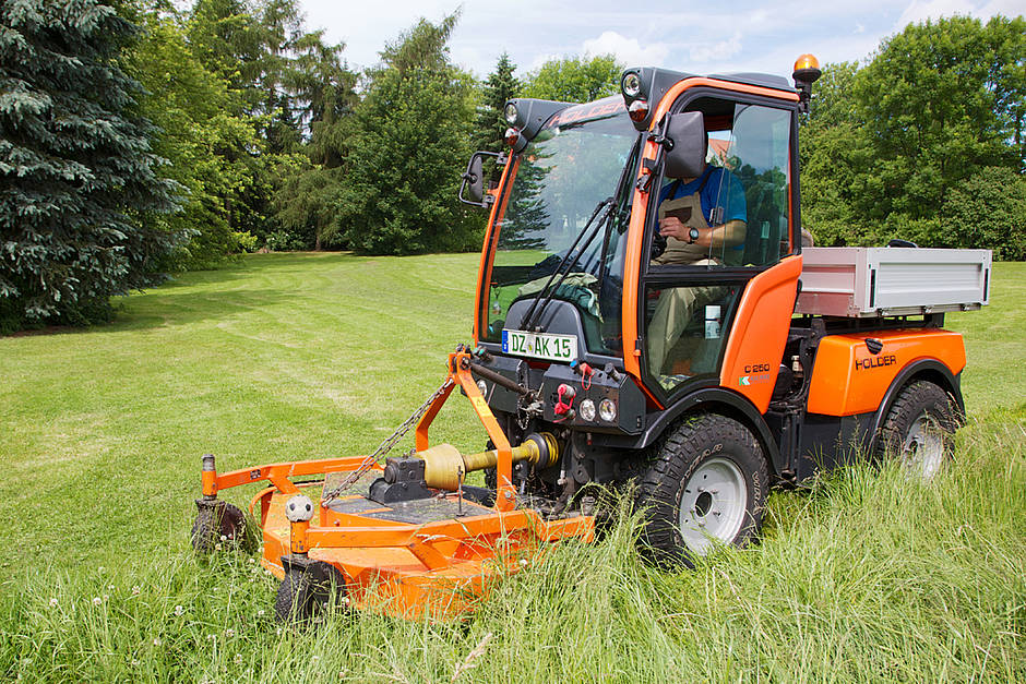 Gerade von April bis Oktober überzeugt der C 250 der Firma Max Holder durch seine Vielseitigkeit in der Rasenpflege. Ob mähen, mulchen, kehren, aerifizieren, vertikutieren, düngen, oder bewässern– an den Holder können alle nötigen Anbaugeräte schnell und unkompliziert angebaut werden. So erhalten unterschiedlichste Flächen von der blühenden Wiese bis zum Sportrasen ein gepflegtes Erscheinungsbild.