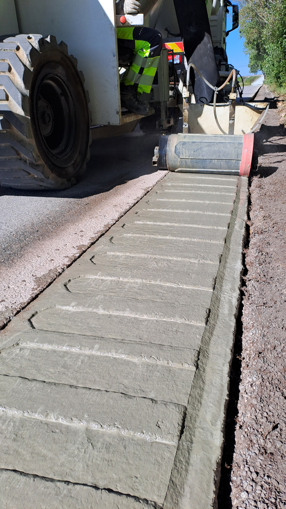 Er ermöglicht eine mechanisierte Bearbeitung und Profilierung der Bankette und presst die Betonmasse (Ortbeton) über eine Förderschnecke in die Gleitschalung worin der Beton verdichtet, in Form gebracht und ein Rillenprofil in die Oberfläche geformt wird – alles in einem Arbeitsgang. Egal ob Steigungen, starkes Gefälle oder enge Kurven, die Maschine passt das Bankett an jede Straßenform an. Wahlweise kann das Bankett dabei eine Breite von 30 oder 50 cm haben. Querrillen im Bankett ermöglichen es dem Wasser leichter von der Straße abfließen zu können und haben einen hohen Sicherheitseffekt.