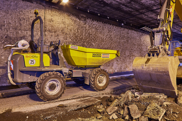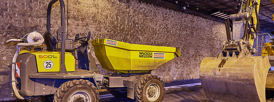Sehr wichtig war bei diesem Projekt die schnelle Bereitstellung der gemieteten Maschinen. Diese und weitere Anforderungen der Baustelle wurden kurzfristig und zufriedenstellend erledigt. Carsten Weding, Technischer Berater der BMTI: „Hier war Wacker Neuson unschlagbar. Innerhalb von nur 14 Tagen standen uns die Maschinen auf der Baustelle zur Verfügung.“ Für die Bauarbeiten wurden zwei Mobilbagger EW100 sowie zwei Dumper 5001 von Wacker Neuson angemietet – allerdings erforderten die Arbeiten im Tunnel einige spezielle Anpassungen: Die 10-Tonnen-Mobilbagger sollten über einen Dieselpartikelfilter (DPF) sowie eine Höhenbegrenzungsanlage für den Verstellausleger verfügen, die zunächst noch eingebaut werden mussten. Zudem waren unterschiedliche Anbaugeräte gefordert, darunter Hydraulikhammer, Greifer, Tieflöffel und Grabenräumwanne. Bei den beiden Dumpern 5001 war die Nachrüstung eines DPF notwendig.