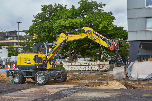 Die 10-Tonnen-Mobilbagger EW100 überzeugen durch Leistung, geringen Verbrauch und anwenderfreundliche Funktionen. Der EW100 ist der schnellste Mobilbagger seiner Klasse mit einer maximalen Geschwindigkeit von 40 Kilometern pro Stunde. Ein minimierter Kraftstoffverbrauch mit Einsparungen von bis zu 20 Prozent wird durch ein optimiertes Hydrauliksystem und den Betriebsmodus ECO erzielt. Auf der Baustelle am Wallringtunnel überzeugen die Bagger mit ihren unterschiedlichen Anbauwerkzeugen im täglichen Einsatz. Die beiden Dumper 5001 verfügen über eine Nutzlast von 5.000 Kilogramm und legen bis zu 25 Kilometer pro Stunde zurück. Damit laufen schnelle Transportaufgaben bei den Sanierungsarbeiten reibungslos ab. Neben den gemieteten Maschinen sind auch Eigengeräte wie ein 6-Tonnen-Mobilbagger von Wacker Neuson bei den Bauarbeiten im Einsatz. Auch diverse Hämmer, Stampfer und Vibrationsplatten von Wacker Neuson werden auf der Baustelle genutzt.