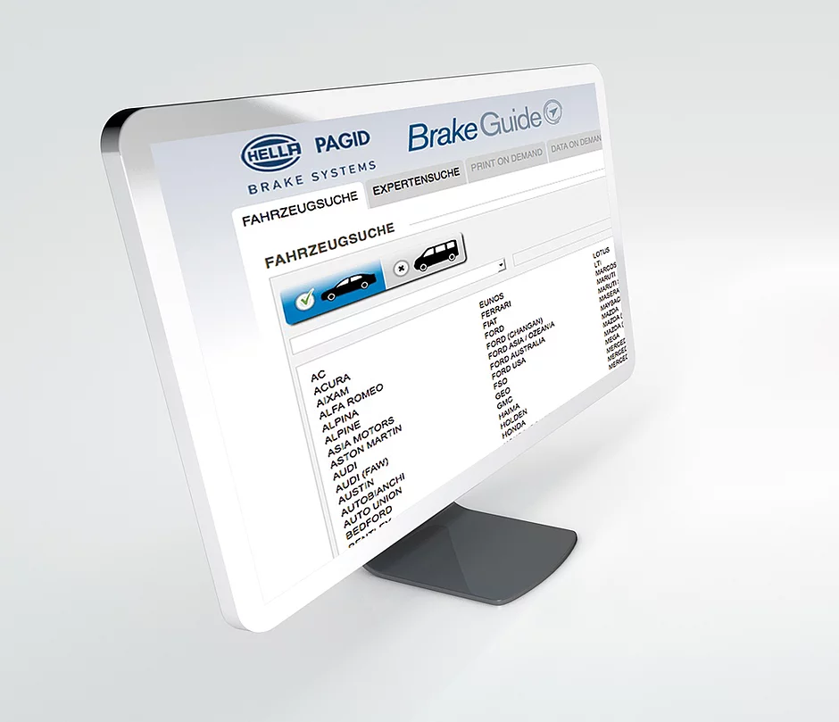 Der BrakeGuide basiert auf wöchentlich aktualisierten TecDoc-Daten und bietet Werkstätten verschiedenste Suchfunktionen. Neben der allseits angebotenen Fahrzeug- und Artikelsuche, ermöglicht die Expertensuche eine flexible Recherche über Artikelkriterien. Durch eine optimierte Benutzeroberfläche, ermöglicht der BrakeGuide dem Kunden eine intuitive und gezielte Identifikation von Bremsenteilen aus dem Hella Pagid Sortiment. Darüber hinaus können Kunden selbstständig individuelle Kataloge in druckfähigem Format erstellen. Diese Kataloge entsprechen dem typischen Hella Pagid Kataloglayout und können nach individuellen Anforderungen online erstellt werden.