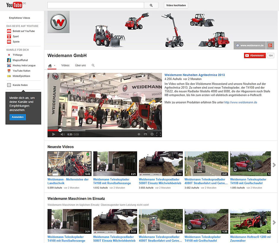 Diemelsee-Flechtdorf. Einsatzvideos liegen im Trend, die Video-Plattform YouTube boomt deshalb. Seit Mitte Dezember ist dort auch der Hoftrac®-, Radlader- und Teleskopladerspezialist Weidemann mit einem eigenen Kanal und diversen Videos vertreten. Der neue YouTube Channel ist unter Weidemann GmbH zu finden. Interessierte können derzeit bereits dreizehn verschiedene Videos ansehen. Bereits in den ersten vier Wochen wurden die Filme mehr als 25.000 Mal aufgerufen.