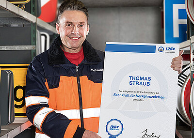 Auf der Schulungsplattform www.schilder-wissen.de lernen die Teilnehmer in dreizehn anschaulichen Filmen alles über Verkehrszeichen. Werden die anschließenden Fragen korrekt beantwortet, erhalten die Teilnehmer zunächst das Einsteiger-Zertifikat, später das Fortgeschrittenen-Zertifikat und qualifizieren sich als zertifizierte Fachkraft für Verkehrszeichen. Zusätzliche Informationsmaterialien zu besonderen Themen können unter der Rubrik „Wissen Kompakt” auf der Website kostenlos heruntergeladen werden. Darauf können die Besucher der Website sogar ohne Anmeldung zugreifen. Kostenfrei auf www.schilder-wissen.de registrieren und direkt fortbilden.