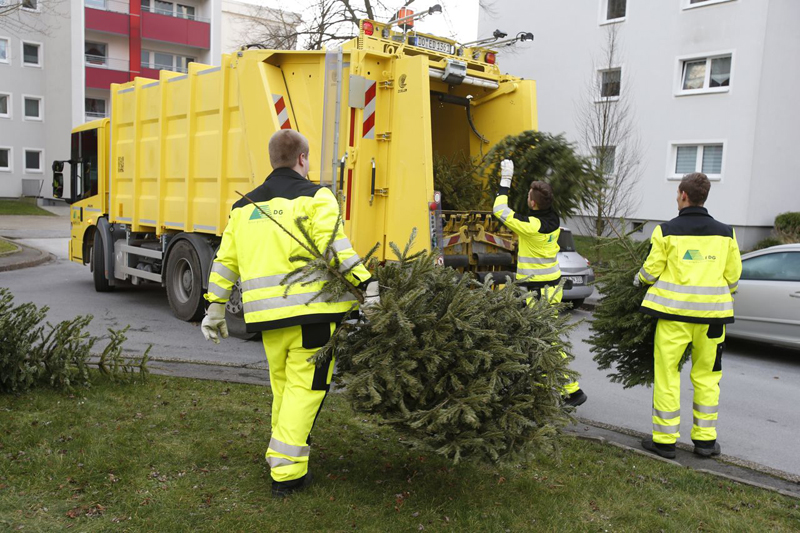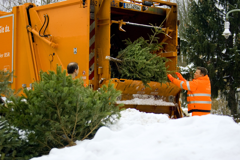 In Hessens größter Stadt setzt die Frankfurter Entsorgungs- und Service GmbH (FES) bei den alten Weihnachtsbäumen gleich auf zwei Varianten, was das Einsammeln angeht. Zum einen wird der alte Baum im Laufe des Januars zusammen mit der Bio- oder der Restmülltonne entsorgt. Dafür muss das Gewächs auf lauter Ein-Meter-Stücke zurückgekürzt und am Tag der Müllabfuhr neben die Tonne gelegt werden. Die Weihnachtsbäume wie auch der Unrat werden dann gemeinsam in den Müllwagen befördert und kommen – je nach Tonne – entweder ins Müllheizkraftwerk oder in die Kompostanlage des FES-Tochterunternehmens Rhein-Main-Biokompost (RMB) GmbH. Zum anderen wird in einem Zeitraum von drei Wochen im Januar ein Sonderfahrzeug eingesetzt, das ausschließlich die einzeln rausgelegten Christbäume einsammelt. Dafür werden bestimmte Tage festgesetzt, an denen es in die Stadtteile kommt. Die Bürger müssen die Bäume dafür an ihre Grundstücksgrenzen legen – leicht zugänglich und von der Straße aus sichtbar. Für die zweite Entsorgungsvariante ist es nicht nötig, die Gewächse zu kürzen. Denn das Sperrmüllauto – ein 3-Achser-Presswagen mit einer offenen Auflegefläche – ist mit einem Mechanismus ausgestattet, der die Bäume beim Verladen zerkleinert, erklärt Stefan Röttele, Pressesprecher bei der FES. Die gepressten Bäume werden ebenfalls – wie auch der gesamte Grünschnitt in Frankfurt – zur RMB GmbH gebracht. Dort werden sie kompostiert, damit wieder neue Weihnachtsbäume entstehen können, fasst Röttele den Kreislauf zusammen. Die Stadt Frankfurt verspricht sich mit diesem System einen schnelleren Abtransport der mehreren tausend Weihnachtsbäume. Noch nicht lange bietet die FES beide Varianten an. „Wir sehen aber jetzt schon einen Erfolg“, berichtet Röttele begeistert. Vor allem das Sonderfahrzeug würde den Bürgern noch mehr verdeutlichen, dass jetzt die alten Weihnachtsbäume abgeholt werden. In stark frequentierten und sehr verdichteten Vierteln wie der Innenstadt oder rund um den Bahnhof kommt die Stadtreinigung täglich und nimmt die rausgelegten Bäume auf, so dass keine separate Sammlung stattfinden muss. Über die Wertstoffhöfe landen auch diese Gewächse schließlich in der Kompostieranlage. Alternativ dazu können die Frankfurter ihre alten Weihnachtsbäume aber auch direkt bei der RMB GmbH oder im Rahmen des Kofferraumservice – eine Kofferraumfüllung ist kostenlos – an den FES-Wertstoffhöfen abgeben. Schätzungsweise 80.000 Weihnachtsbäume werden von den Frankfurtern jedes Jahr entsorgt. Nur wenn die ausgedienten Pflanzen über die Restmülltonne entsorgt werden, werden sie anschließend verbrannt. Im Müllheizkraftwerk wird dabei Strom und Fernwärme erzeugt.