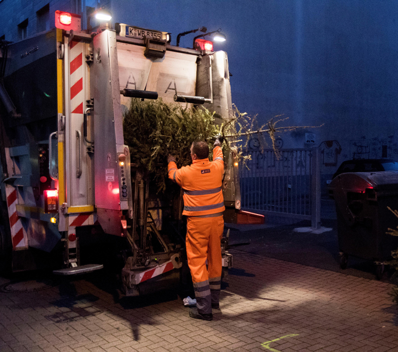 Auch in diesem Jahr kümmert sich die AWB (Abfallwirtschaftbetriebe) Köln wieder um die Entsorgung der alten Christbäume. Die Bürger haben hier sogar drei Wahlmöglichkeiten. Gleich nach Neujahr können die ausrangierten Bäume – auf eine Länge von maximal zwei Metern gekürzt – einfach mit der Bio- oder Restmülltonne am Tag der Müllabfuhr hinausgestellt werden. Genauso gut können die Kölner die Bäume aber auch zu den Öffnungszeiten an den Wertstoff-Centern abgeben. Zusätzlich werden in der ganzen Stadt Sammelstellen eingerichtet, an denen die Christbäume ebenfalls entsorgt werden können. Hierbei sind die Männer der AWB entweder mit LKW oder ebenfalls mit Sperrmüllwagen, ausgestattet mit einem Pressmechanismus, unterwegs. „Wir sind der Transporteur“, erklärt Wilfried Berf von der Pressestelle. Die ausgedienten Weihnachtsbäume, die zusammen mit der Müllabfuhr entsorgt werden, wandern in die Verbrennungsanlage. Die anderen 60 bis 70 Prozent der Bäume, die an den Sammelstellen abgeholt werden, kommen zur Kompostieranlage in Köln.