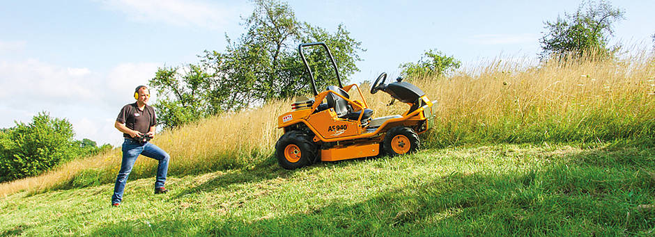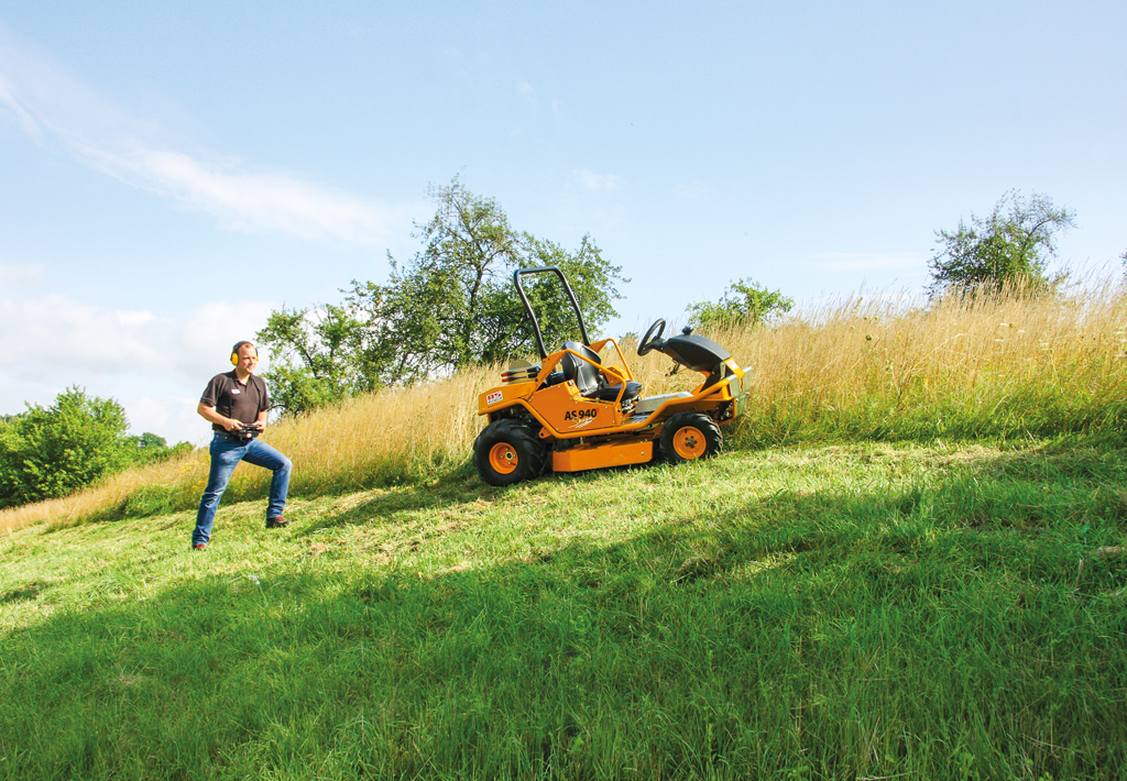Mit den Aufsitz-Allmähern lassen sich Hanglagen bequem und ökonomisch mähen. In vielen Geländen gibt es jedoch immer wieder Bereiche, in denen das Mähen für den Fahrzeugführer sehr unangenehm ist: steiles Gelände, loser Untergrund, das Mähen unter Bäumen und Büschen, entlang von Hecken, Brennnesseln und Wespennester. Manchmal erzeugen Geländeunebenheiten störende Vibrationen. Aus diesem Grund hat AS-Motor den erfolgreichen Sherpa Aufsitzmäher um eine wichtige Funktion erweitert, das Mähen per Fernsteuerung. So kann immer dem Gelände angepasst ideal gemäht werden, zum Beispiel: