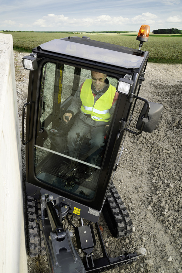 Die neuen Modelle in der 1,5-t-Klasse sind mit zusätzlichem Ein- und Ausstieg rechts ausgestattet – ein Vorteil bei Straßenbaustellen und gut für direkte Kommunikation und Sicht zur rechten Seite hin. Die neue XL-Kabine bietet den Raum und Komfort wie ein 3,5 Tonner. Für den schnellen Einstieg lässt sich die Konsole komplett wegklappen – der Fahrer bleibt beim Einsteigen nicht hängen. Der Fußraum bietet Platz genug - auch für Schuhgröße 48 und größer. Überhaupt lässt sich der Arbeitsplatz individuell auf die Fahrergröße bequem einrichten. Die großzügigen Glasflächen erlauben eine optimale Sicht auf Anbauwerkzeug und Arbeitsumgebung, insbesondere die Kette rechts unten ist gut im Blick.