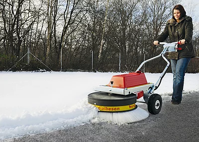 Außerdem ist die Maschine mit einer Start-/Stopp-Automatik ausgestattet, die als sogenannte Totmanneinrichtung funktioniert und verhindert, dass die Bürsten weiter rotieren, wenn der Schalter nicht mehr gedrückt wird. Ist der Anwender also handlungsunfähig, stoppt die Maschine automatisch die Rotation der Bürstenfunktion. Ein Spritzschutzblech schützt vor unkontrolliert herumfliegendem Kehrgut oder offenliegenden, rotierenden Drahtbürsten.