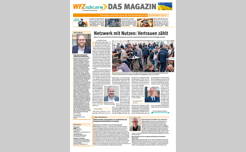 Eine neue Ausgabe der Fachpublikation von „DAS MAGAZIN“ mit dem Titelthema „Netzwerk mit Nutzen: Vertrauen zählt“ hat das WFZruhr im Dezember veröffentlicht. Die Fachpublikation stellt überzeugend dar, welche wertvollen Vorteile Networking in der Branche für die erfolgreiche Transformation zu einer Circular Economy bietet und zeigt auf, welche Relevanz die Schlüsselfaktoren Regionalität, Vertrauen und Einfluss für eine nachhaltige Netzwerkarbeit darstellen.