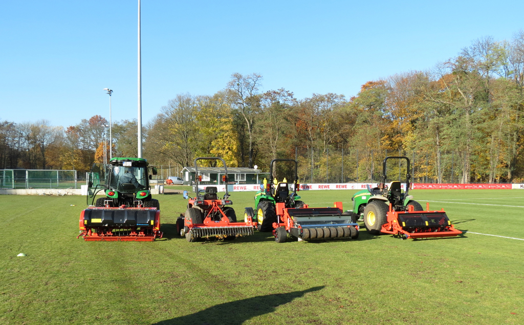 Um dieser Klientel künftig noch besser unter die Arme greifen zu können, hat man mittlerweile weitere Anbaugeräte angeschafft, so dass nun alle üblichen Arbeitsaufgaben abgedeckt werden: Zum Tiefenlockern, Tiefenlüften, Igeln, Aerifizieren, Schlitzen, Mähen, Nachsähen und Einbürsten sowie zur Platzlockerung – alle von Wiedenmann. Der Hersteller gilt als einer der führenden Anbieter von Geräten für Grünflächenpflege, Schmutzbeseitigung und Winterdienst. Sie zeichnen sich durch Leistungsstärke, Bedienfreundlichkeit und Langlebigkeit aus. Bei Bedarf stellt Mathes seinen Kunden sogar einen Anwendungsexperten zur Seite, der vor Ort einweist und mit anpackt. Dass das bundesweit vergleichsweise umfangreiche Leistungsangebot dieses an zwei Standorten mit 44 Mitarbeitern vertretenden Händlers gern angenommen wird, beweisen nicht zuletzt prominente Kunden wie Borussia Mönchengladbach, VfL Bochum und der 1. FC Köln.