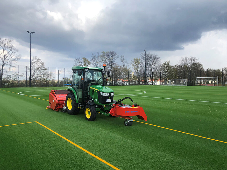 Wiedenmann hat für die Saison 2021 eine Maschinenkombination vorgestellt, die unverfüllten Kunstrasen effizient und gründlich reinigt. Besonders in der trockenen Jahreszeit lohnt sich das „Turboteam“, da Spieler dann oft unter Staub und Pollen leiden. Platzbetreiber oder Dienstleister können hierdurch sowohl die Grob- als auch Intensivreinigung produktiv in nur einem einzigen Arbeitsgang erledigen. Idealerweise benötigen Nutzer einen Kompakttraktor mit einem Zapfwellenantrieb mit 540 U/min am Heckdreipunkt sowie 1.000 oder 2.000 U/min an der Front.
