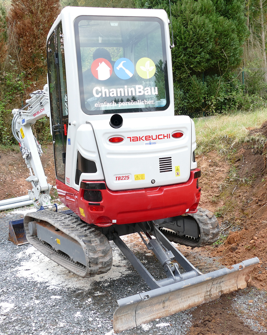 „Mit dem TB 225 können wir Böschungen so präzise und sauber abziehen, als würden wir es mit einer Maurerkelle machen“, beschreibt Boris Chanin die Arbeit mit dem Takeuchi Kompaktbagger. Chanin ist Geschäftsführer von ChaninBau aus Zweibrücken, ein noch junges Unternehmen, das sich auf GaLaBau, Erd-, Wege- und Mauerbau spezialisiert hat. Dabei bietet der Minibagger bei 2,4 Tonnen Gewicht einen 16,5 kW/22,4 PS starken Motor und ein von 1.100 mm auf 1.500 mm teleskopierbares Laufwerk. Seine maximale Grabtiefe liegt bei 2.455 mm, und die Auslegergeometrie macht eine maximale Überladehöhe von 2.800 mm möglich. Serienmäßig sind ein hydraulischer Schnellwechsler sowie Powertilt mit zweimal 90-Grad-Drehung montiert.