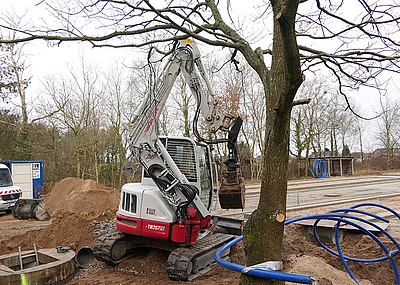 Die Takeuchi-Elektrobagger haben den Vorteil, emissionsfrei und leise zu arbeiten. Ideal also für Innenräume, sensible Gebiete und Umweltzonen. Elektrisch heißt auch kraftvoll, denn es gibt im Vergleich zu den Dieselbaggern keinen spürbaren Leistungsunterschied. Dies ist auch beim Kleinsten, dem batteriebetriebenen TB 10e so, dessen Motor 17,1 PS leistet. Mit der verbauten Batterie kann er je nach Leistungsanforderungen bis zu vier Stunden kontinuierlich arbeiten. Er bietet eine maximale Grabtiefe von 1.755 mm und eine Reichweite von 3.285 mm. Ebenfalls über einen 17,1-PS-Motor verfügt der TB 20e und kann je nach Anforderungen bis zu acht Stunden arbeiten. Seine maximale Grabtiefe beträgt 2.390 mm und die Reichweite 4.090 mm. Eine kontinuierliche Arbeitszeit von bis zu vier Stunden liefert dagegen der 14,7 PS starke Motor des TB 35e, der mit einer maximalen Grabtiefe von 3.205 mm und einer Reichweite von 5.430 mm punktet.