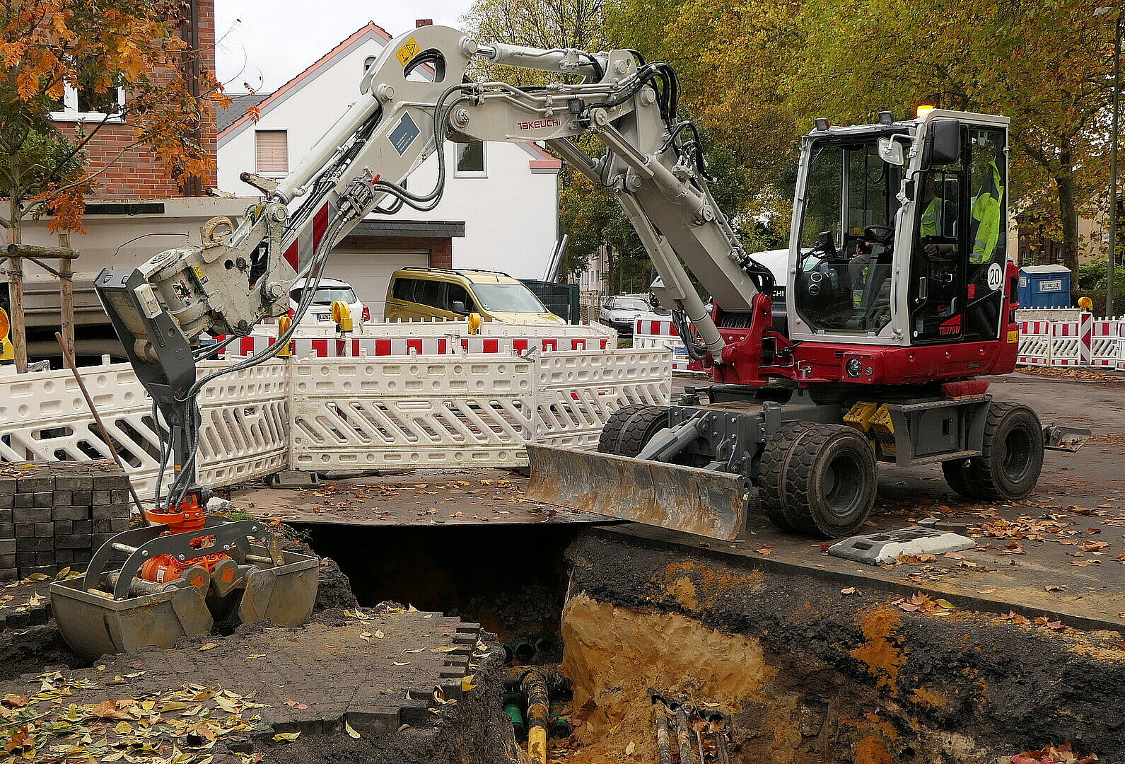 „Schnell müssen sie sein, standfest und genau arbeiten können“, sagt Oleg Heinz, Betriebsleiter der SL Infrastrukturbau aus Lünen. Die Firma ist Teil der Stadtwerke Lünen und vornehmlich für Bau und Unterhaltung des Leitungsnetzes zuständig. Für die Mobilbagger bedeutet dies, häufige Ortswechsel auf eigener Achse und sehr genaues Arbeiten in und an den Leitungsgräben und -schächten. Aktuell müssen sie in Lünen in verschiedenen Straßen mehrere Kilometer Leitungsgräben ausheben. Eine wichtige Voraussetzung ist Standfestigkeit. Sichere Basis sind der niedrige Schwerpunkt der TB 370 W sowie die Achtfach-Bereifung. Ein grundsolides Planierschild sorgt für noch mehr „Bodenhaftung“. „Wir haben zusätzlich Abstützpratzen montieren lassen. Das bringt Sicherheit – auch in sehr anspruchsvollen Bausituationen“, beschreibt Heinz.